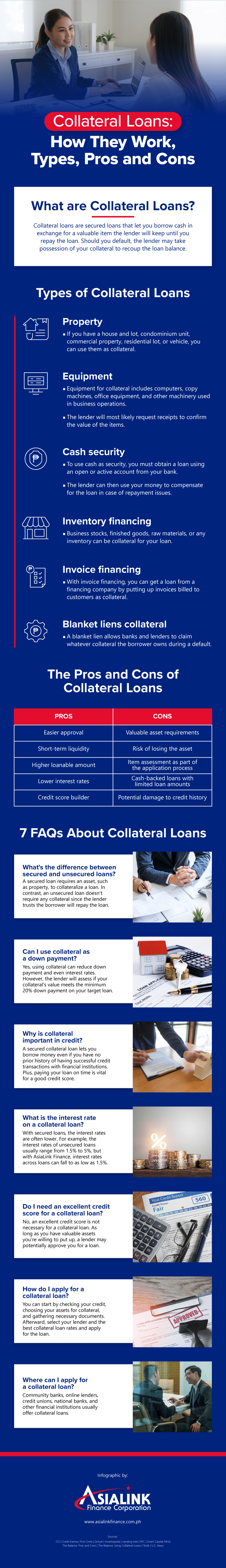 There are multiple sources you can approach for a collateral loan, including community banks, credit unions, national banks, and other financial organizations. You may also apply through a loaning company in the Philippines with institutions like AsiaLink Finance.
