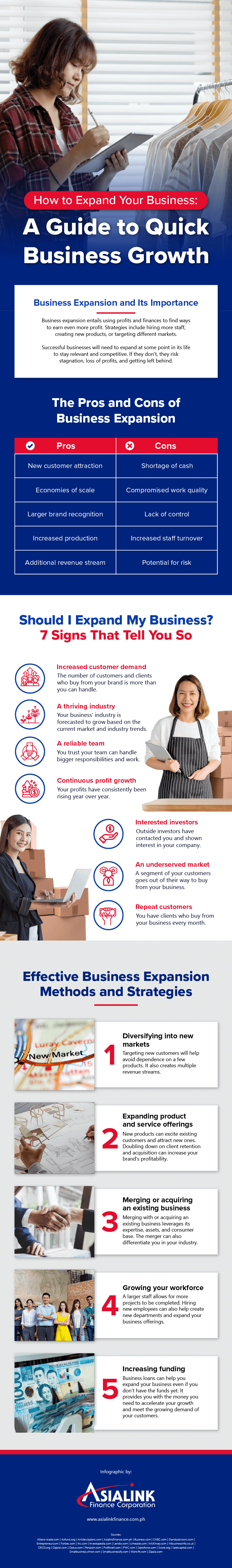 If you’d like to take on a loan to fund your expansion, consider applying with trusted companies such as Asialink Finance. As one of the leading finance companies in the country, it offers a wide array of most convenient and accessible loans with competitive interest rates in the Philippines. Apply for a loan from Asialink Finance today.